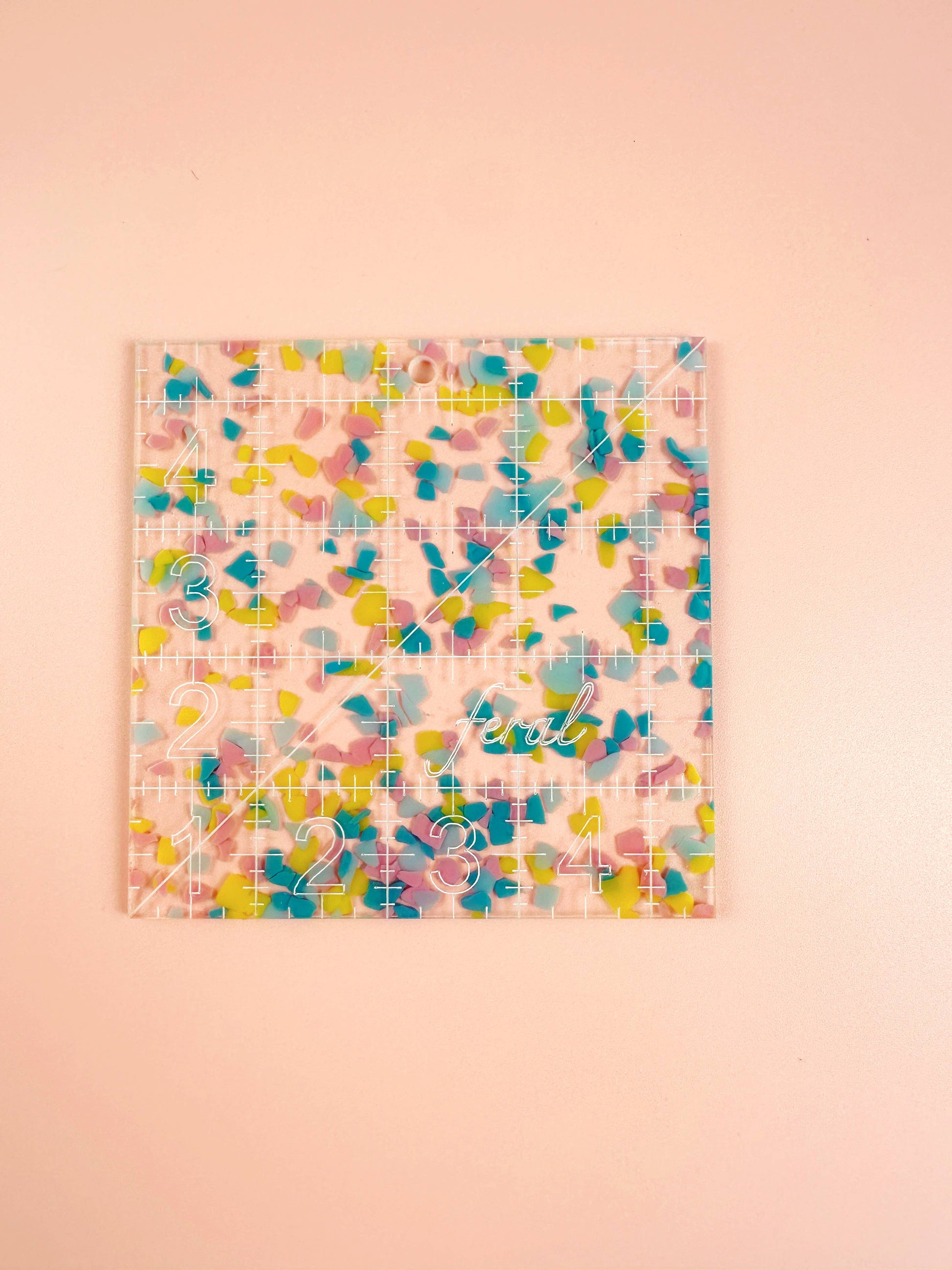 A quilting ruler that is cute AND gets the job done! 4.5 inch square quilting ruler, a perfect size for trimming half-square triangles. Markings are every 1/8 inch, with a diagonal line at 45 degrees for easy half square triangle trimming. Laser cut and engraved from 1/8 inch clear acrylic with golden (coated copper) flakes. The markings are engraved and enameled so they'll never rub off. Non-slip dots provided with every ruler.