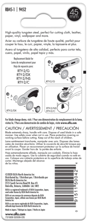 With one blade included in each pack, the Olfa RB45-1 is perfect for general quilting, sewing, and craft projects, and it can even be used in industrial applications. Made of sturdy metal, this rotary blade is built to last and will provide you with smooth, precise cuts for all your fabric-cutting needs.