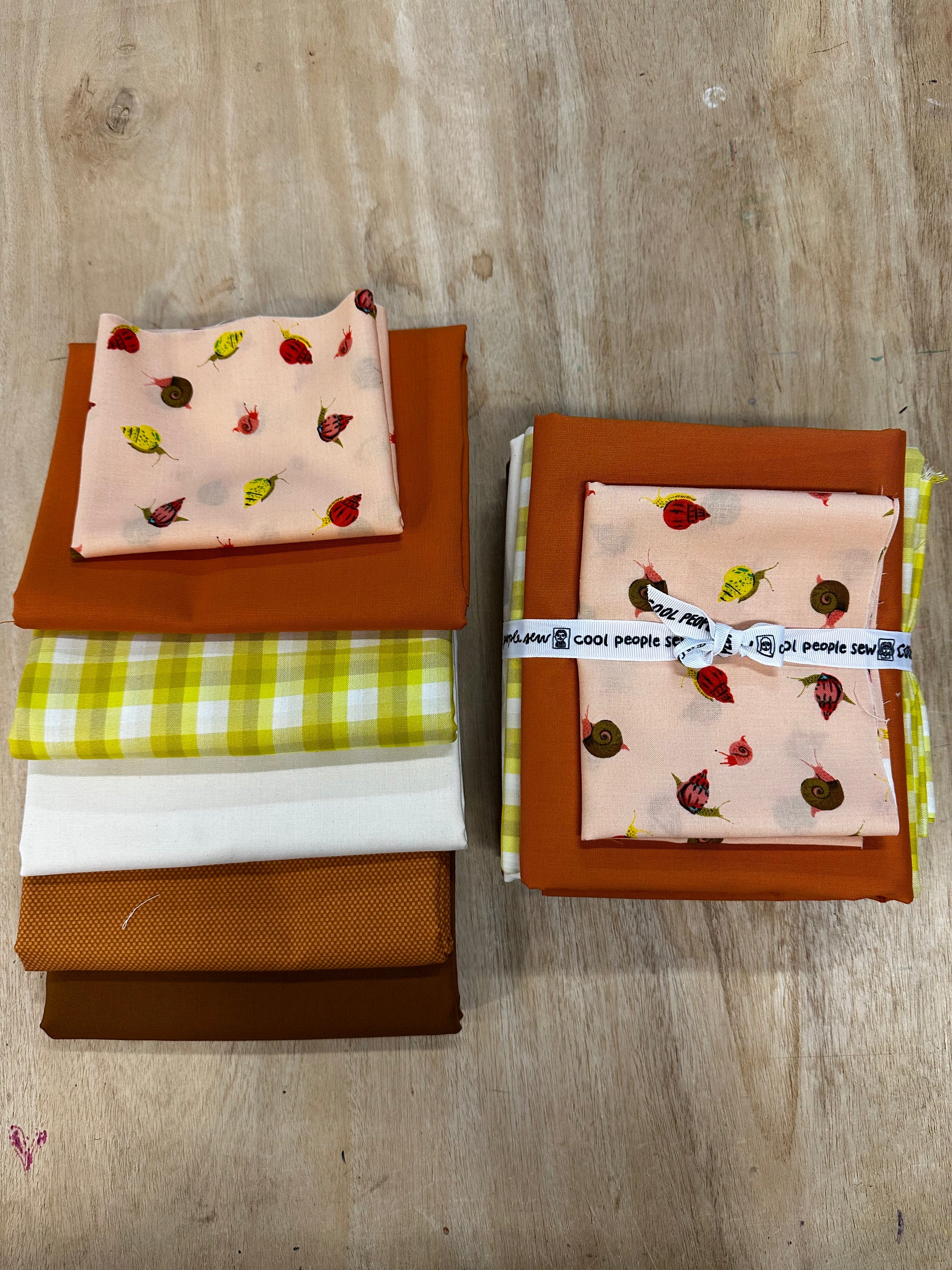 This kit starts with a base of solids and mixes in just enough prints to bring this stunner to life! Consists of Kona Solids in Natural, Cedar, and Roasted Pecan, along with Kitchen Window Wovens in Pickle Gradient, Snails in Peach by Heather Ross, and my favorite blender Poparazzi in Butterscotch. Includes all fabric required for the quilt top.