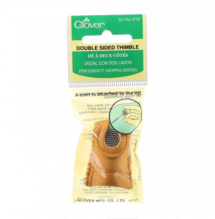 Fine deerskin thimble with a wrap around steel plate which extends all the way over the fingertip for use on both the upper and lower portions of the finger as well as on the fingertip.
