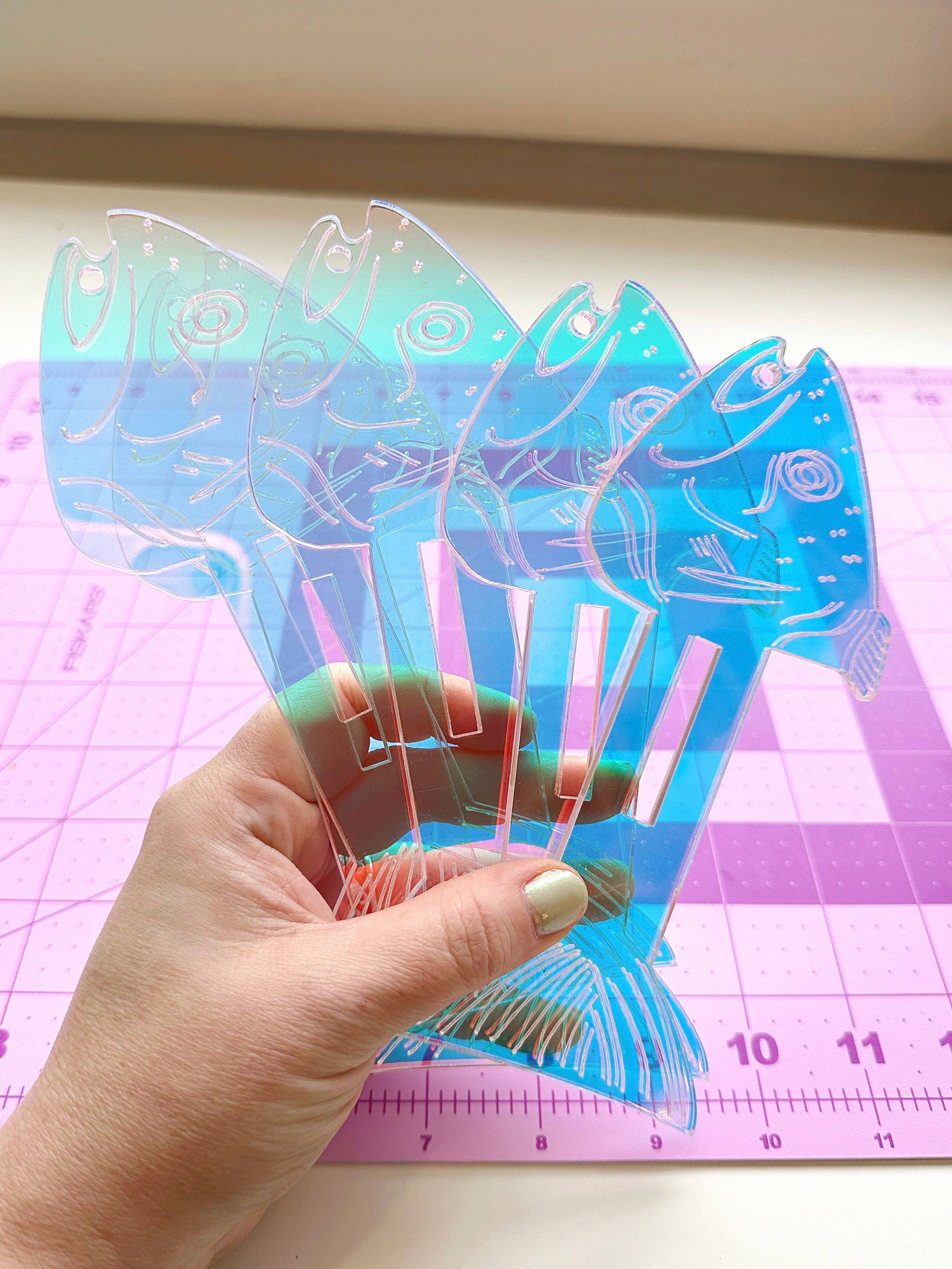Keep your quilt binding tidy with a friendly fish. Holds enough binding for a queen size quilt! Measures approximately 6.5 by 3.25 inches. Made from iridescent 3 mm acrylic.