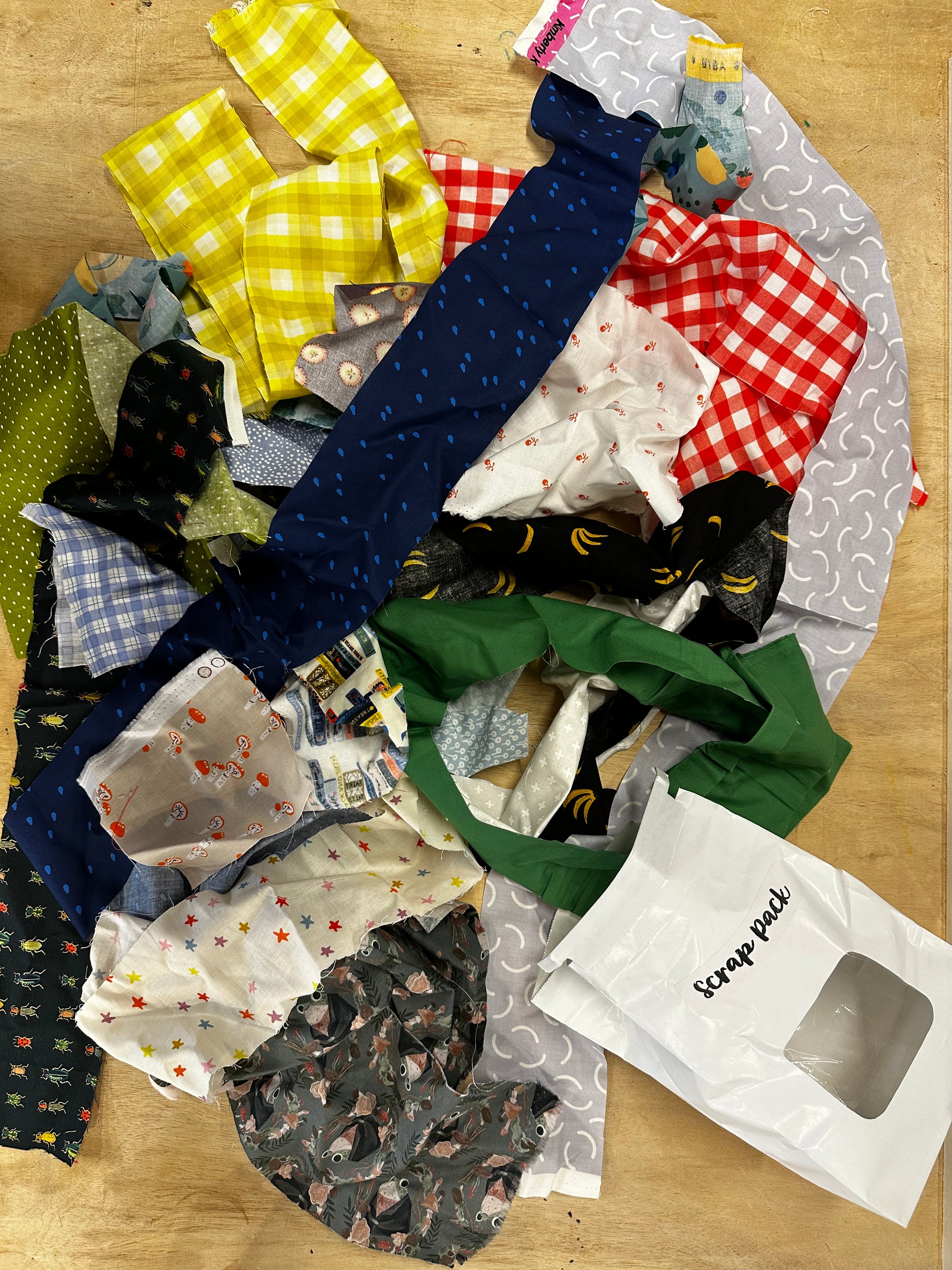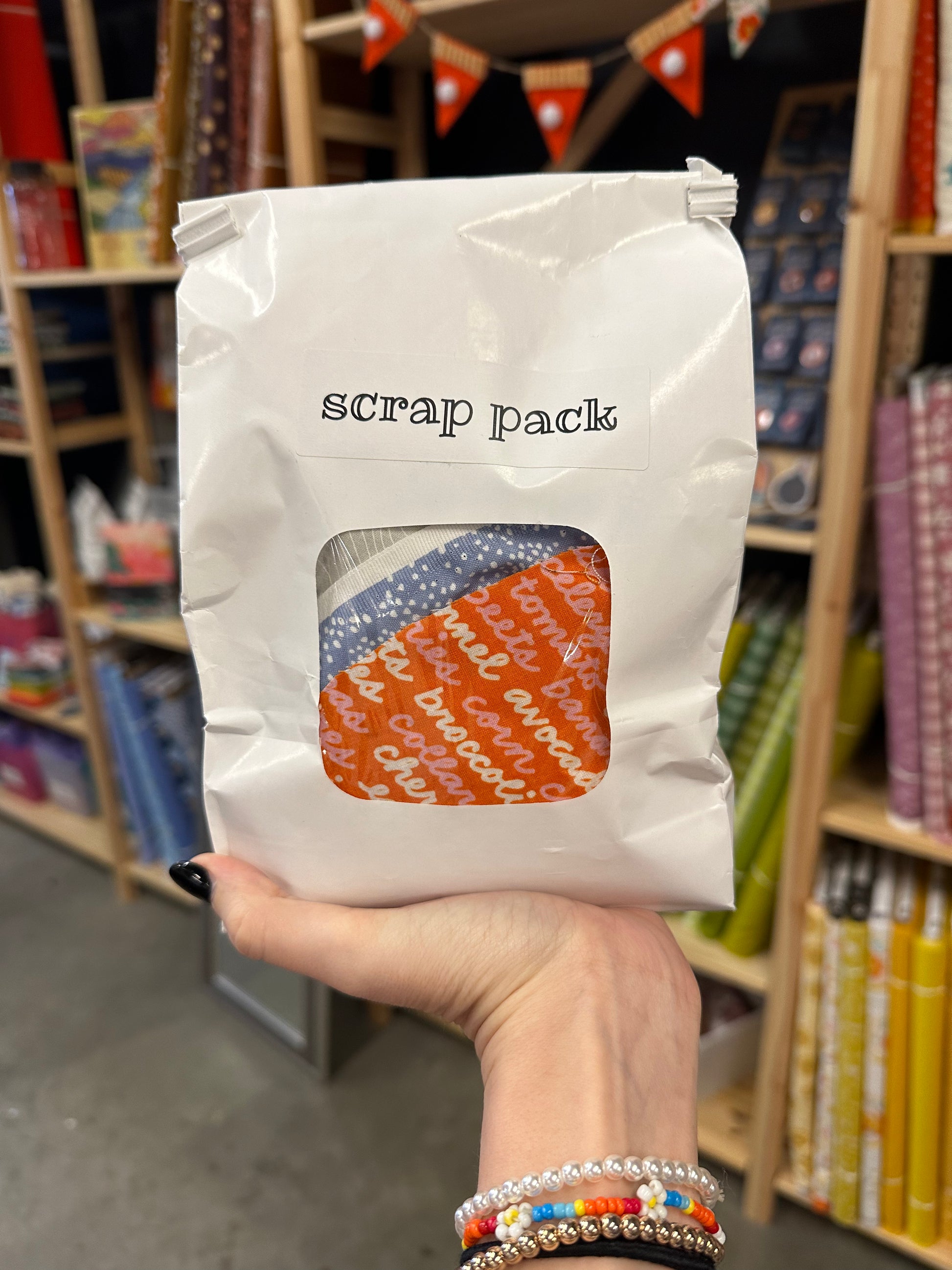 A BUNCH of premium quilting cotton scraps from our sewing studio! You could find Ruby Star, Cotton + Steel, Windham, Rifle Paper, or Heather Ross - but no matter what you’ll have a blast discovering what treasures you got!
