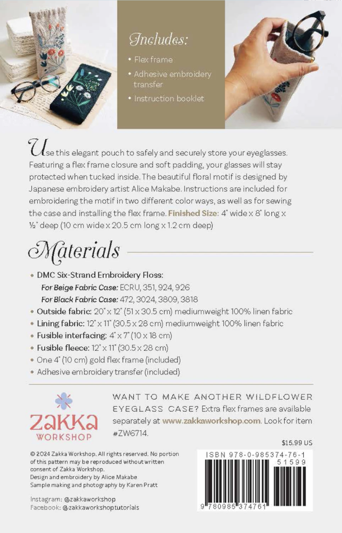 Use this elegant pouch to safely and securely store your eyeglasses. Featuring a flex frame closure and soft padding, your glasses will stay protected when tucked inside. The beautiful floral motif is designed by Japanese embroidery artist Alice Makabe. The kit includes: One flex frame, an adhesive embroidery transfer and an instruction booklet. Instructions are included for embroidering the motif in two different color ways, as well as for sewing the case and installing the flex frame. Finished Size: 4" wide x 8" long x ½" deep (10 cm wide x 20.5 cm long x 1.2 cm deep).